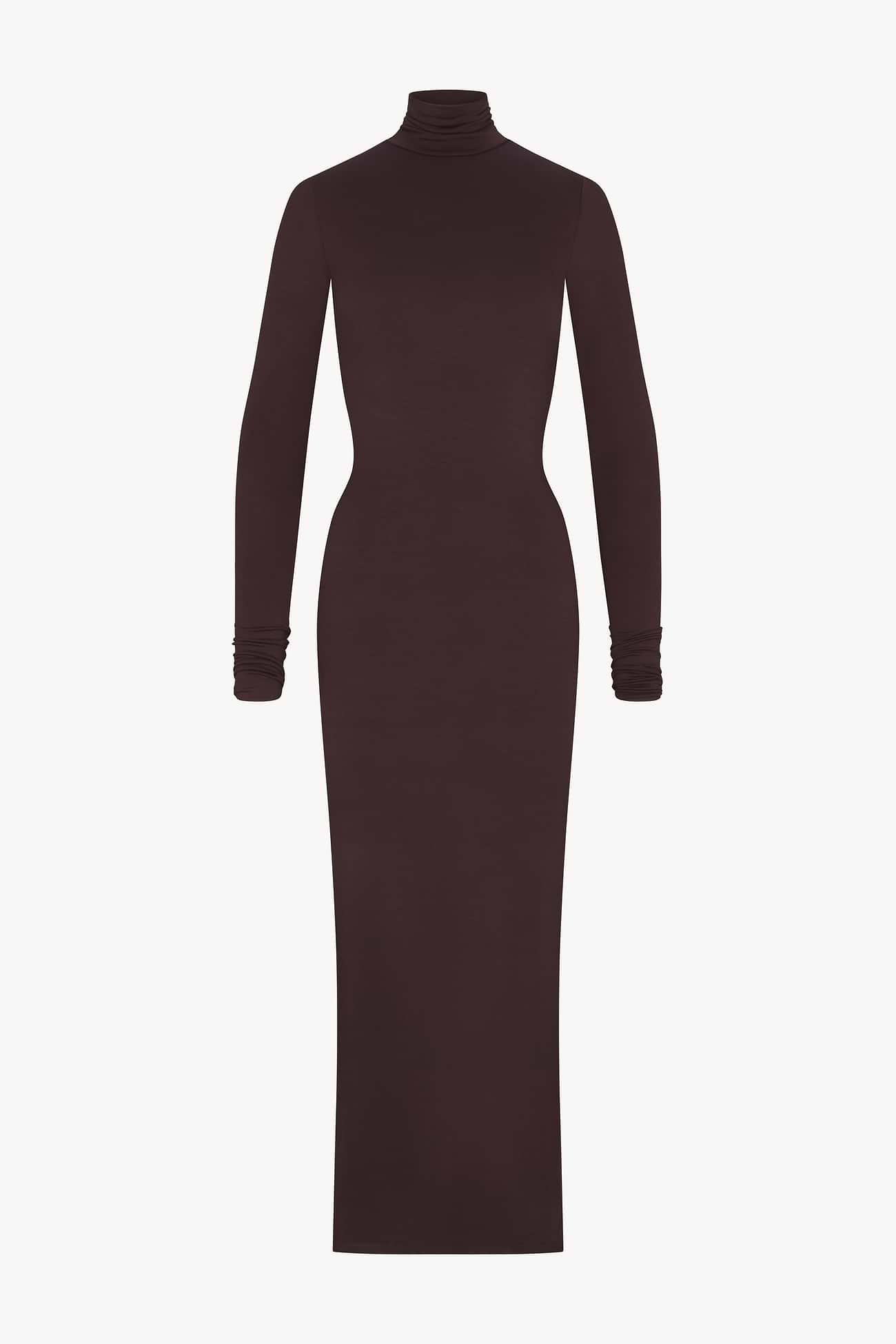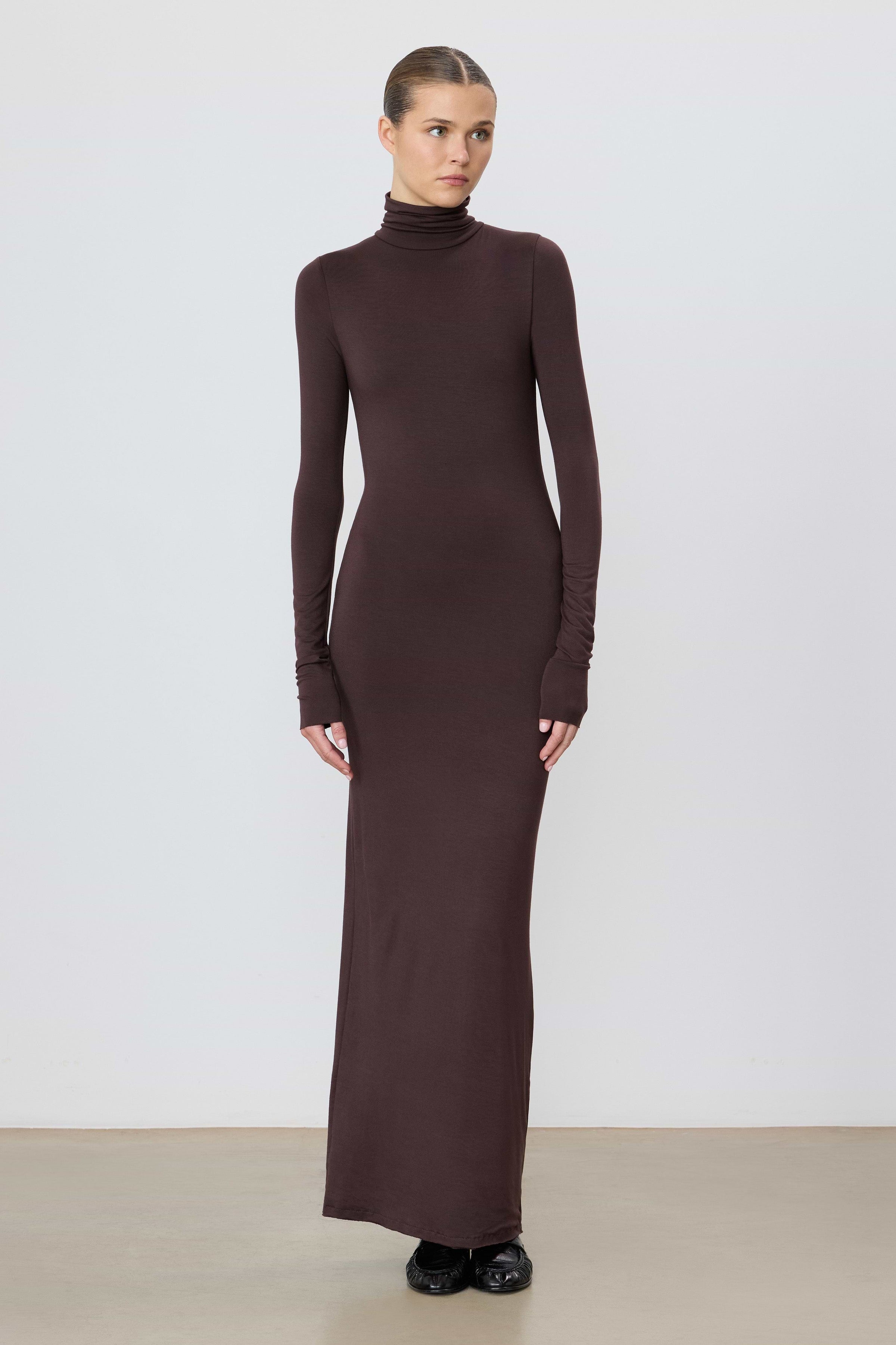 The ÉTERNE Long Sleeve Turtleneck Maxi Dress in Espresso features a slim-fitting silhouette crafted from a soft jersey modal blend. Its maxi length and double-lined fabric provide excellent coverage and support, making it a refined, versatile piece suitable for everyday wear with a touch of sophistication.