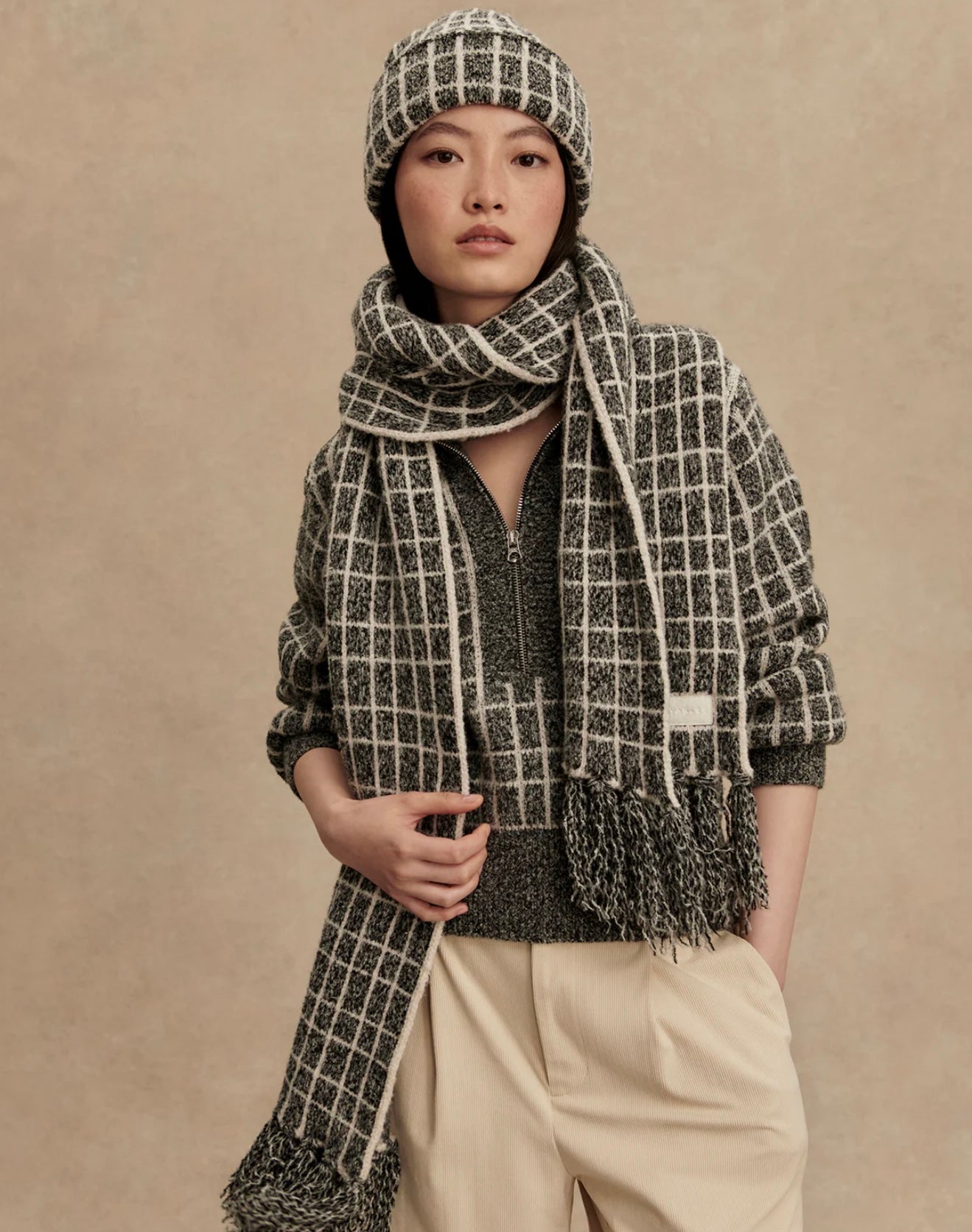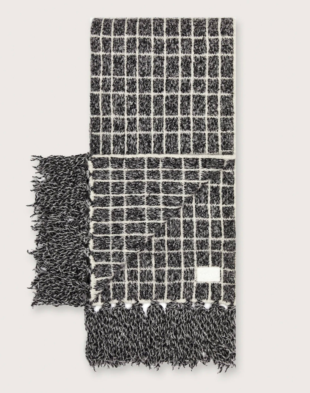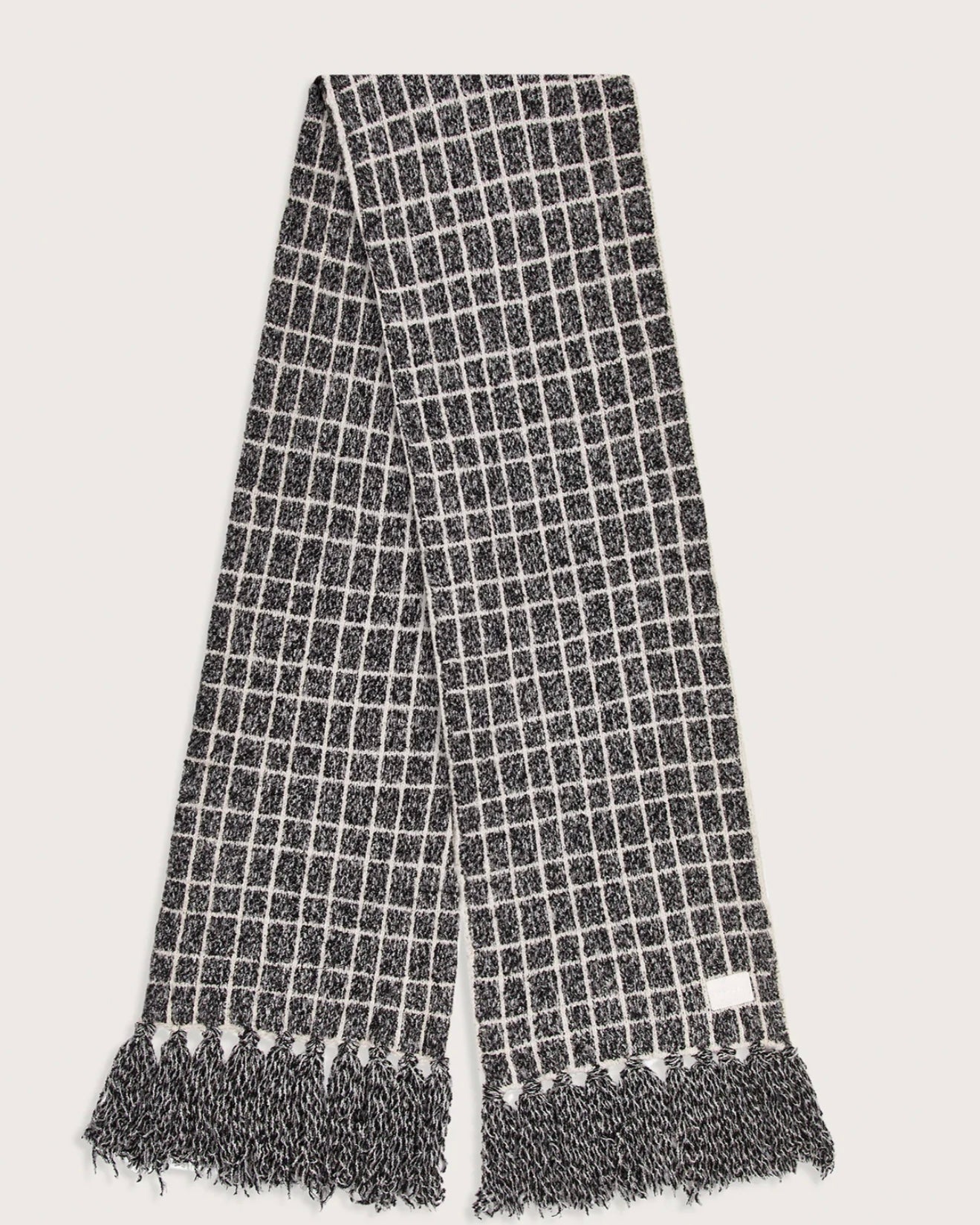 Stay warm and chic with the Lindsey Check Knit Scarf. Made from a soft Cotton Viscose Plush Bouclé yarn, this scarf features a checkered pattern and fringe details, adding an elevated texture to your winter wardrobe. Pair with the Furley half-zip knit and Noel beanie for a coordinated look or wear on its own for a stylish statement.